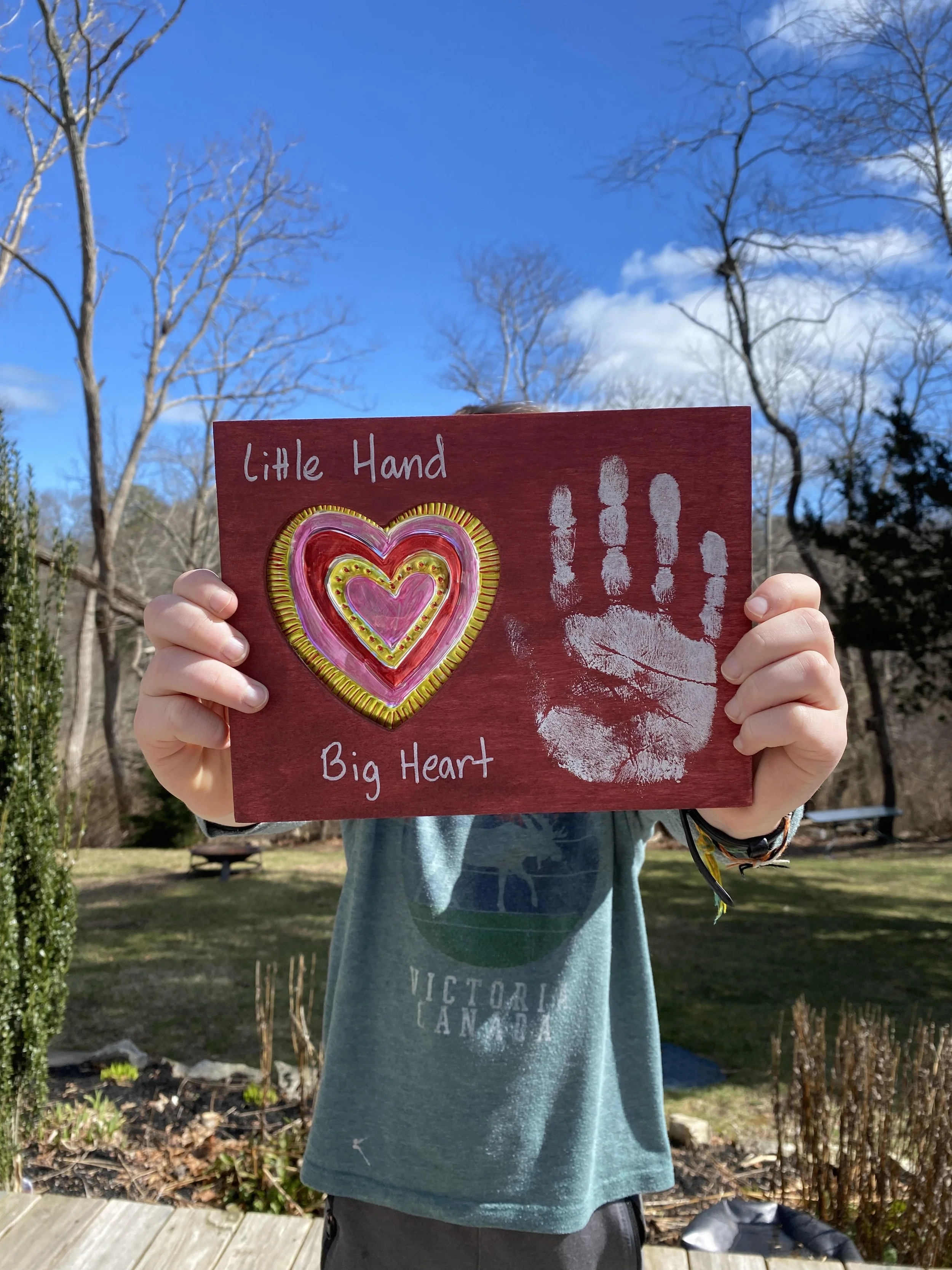 In the workshop, kids will create a metal-embossed heart using a wooden stylus and Sharpies to decorate. To add an even sweeter personal touch, they will add their handprint to the wooden frame next to the completed heart. This finished piece will be cherished for years to come.
